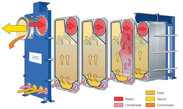 AlfaVap’s advantage is they work also when the temperature differential between the hot and cold fluids approaches as low as 4.5°F meaning that lower grade steam and more effects in series can be use in an evaporation system compared to the shell-and-tube systems.